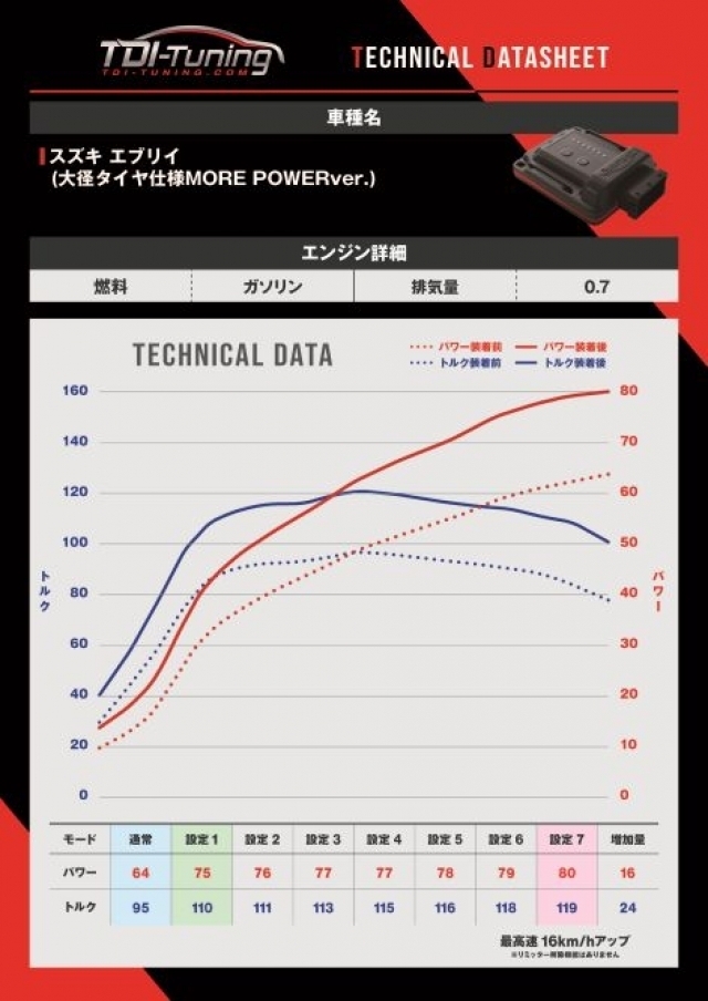 また、パワーアップにより同じ速度でもアクセルを開度が減少するため、燃費の向上も期待できます。